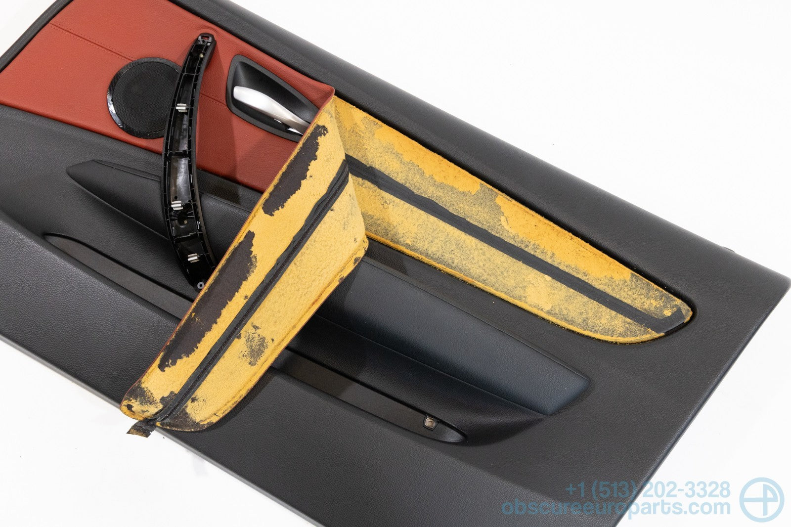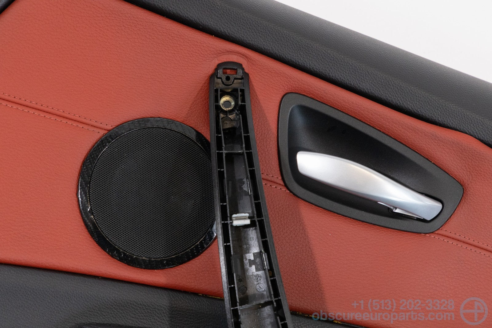 Used BMW right door card in Korallrot Aka Coral Red for the E82 1-Series. The inner door handle and speaker are included with this door card. Item is for parts or repair only. The glue on the red center insert has failed as seen in photo 3. There is a nick at the bottom of the panel as seen in photo 2.